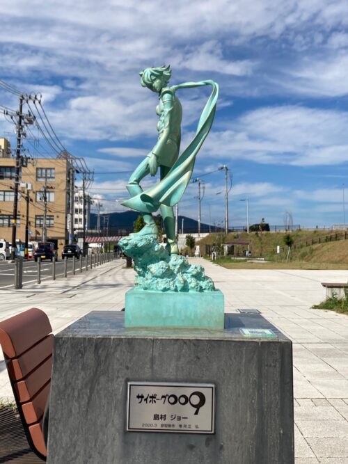 2020年(令和2年)3月に「かわまち交流センター」前に加わったのが、サイボーグ009(ゼロゼロナイン)のブロンズ像。数あるモニュメントの中でも、ひときわ存在感があります。